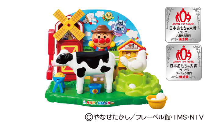 うしの本体とお乳部分に異なる素材を使用し、触感の違いを楽しめる工夫と、スロープや小物の散らばり防止設計。視覚・聴覚に配慮したスイッチの凸点や音声ガイドなどの工夫があります。