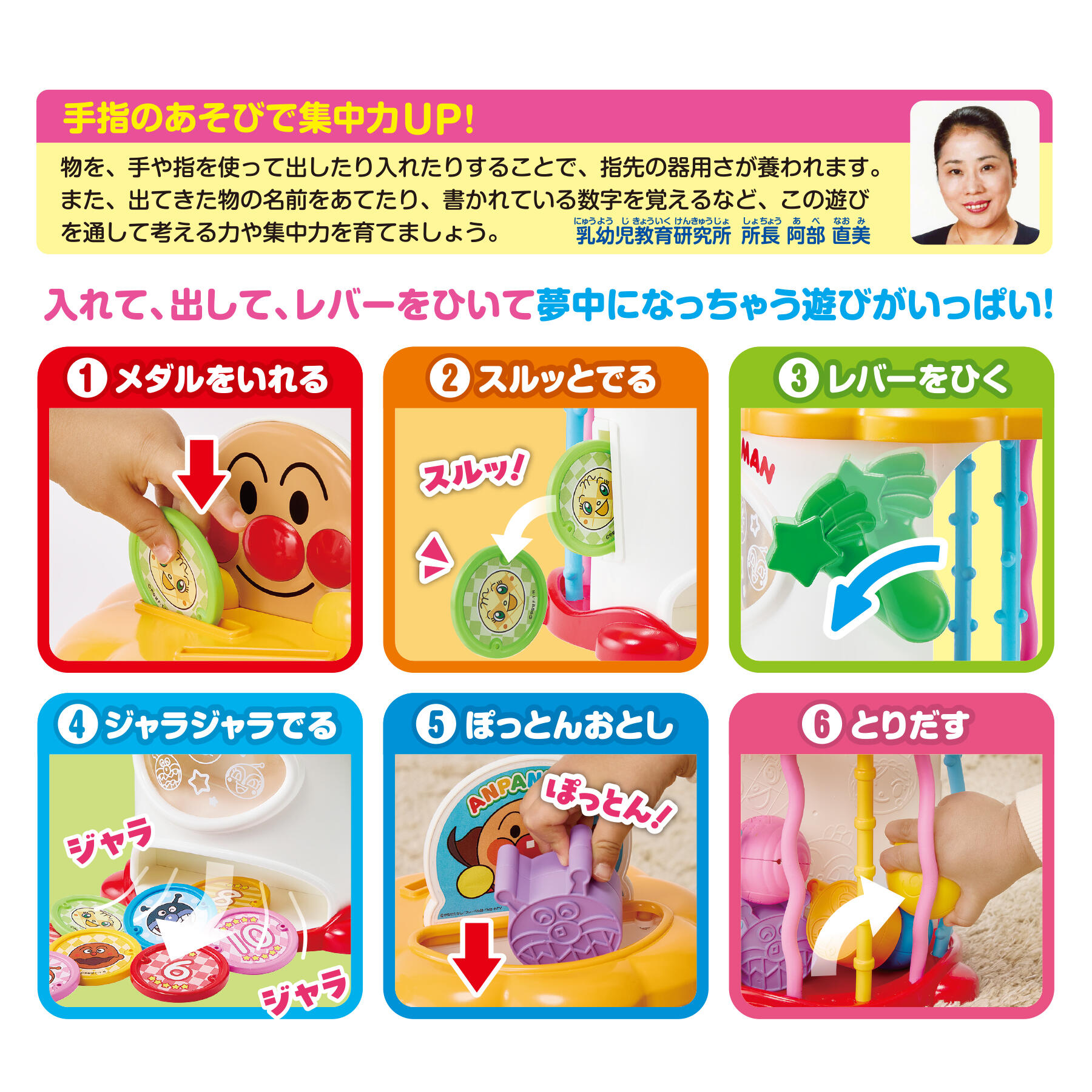 ●メダルがじゃらっと出てくる見た目の楽しさ、定番のぽっとんおとしの遊びとやわらかな取り出し口で、シンプルな動作で繰り返し楽しく遊べます。